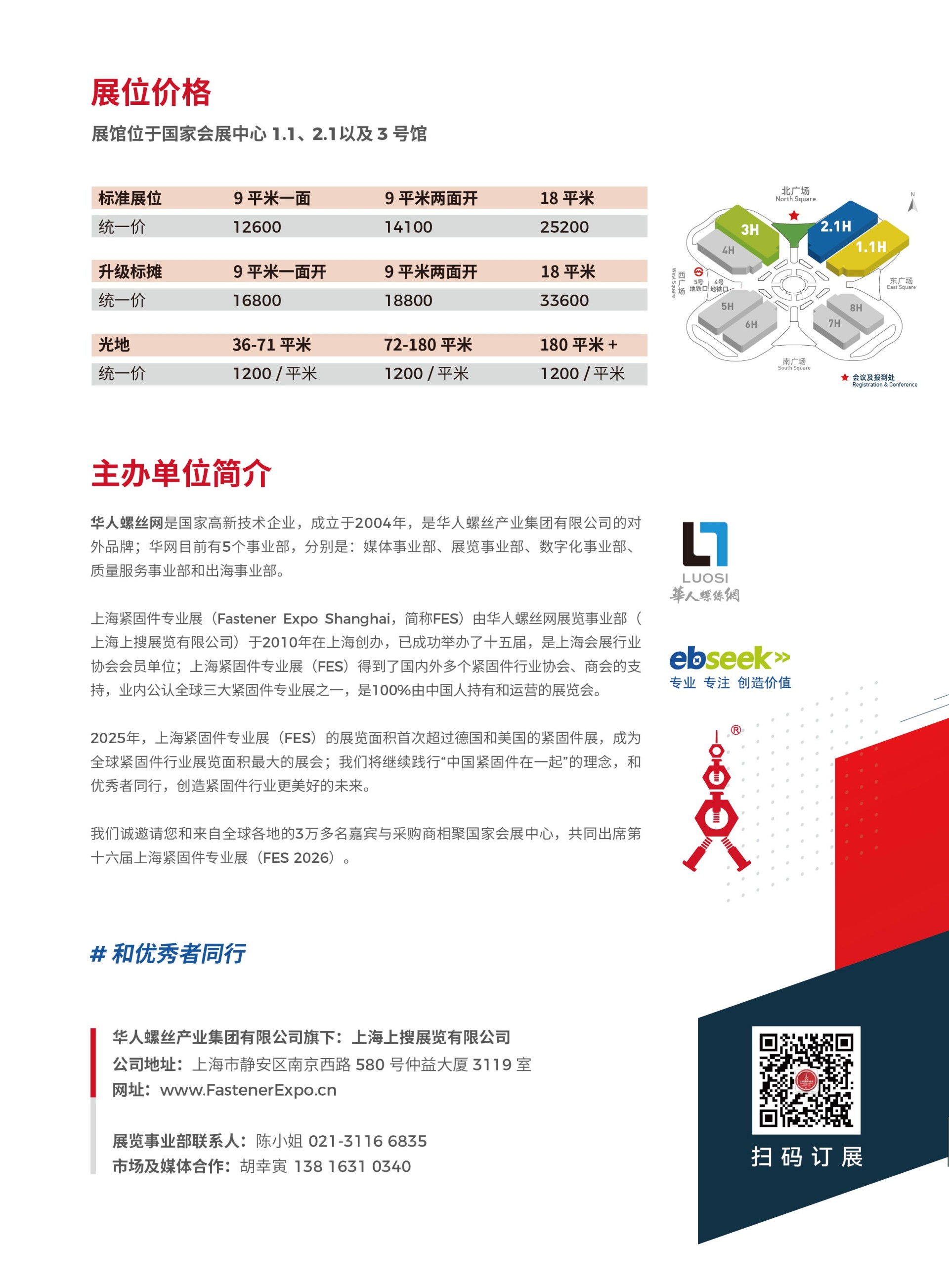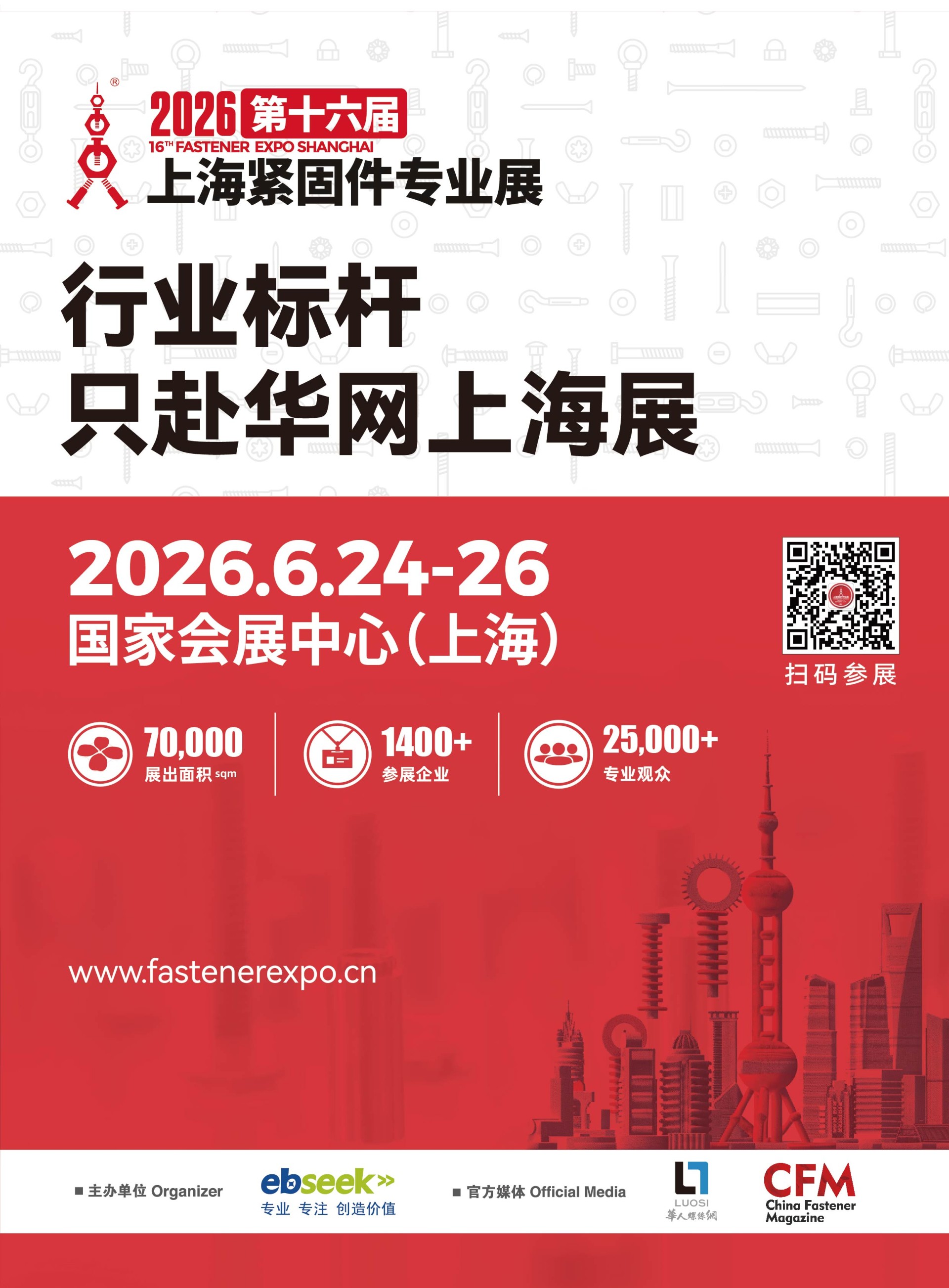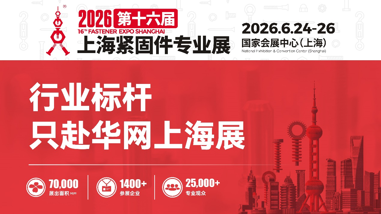 第十六届上海紧固件专业展将于2026年6月24-26日在上海国家会展中心举办。展会将聚焦紧固件成品、冷镦成型、模具耗材、检测包装、表面处理、原材料供应、非标定制等多个细分专业领域,联合1400+参展品牌,共同呈现超70,000平米大规模展览展示,提供紧固件全产业链的产品、技术创新及解决方案。