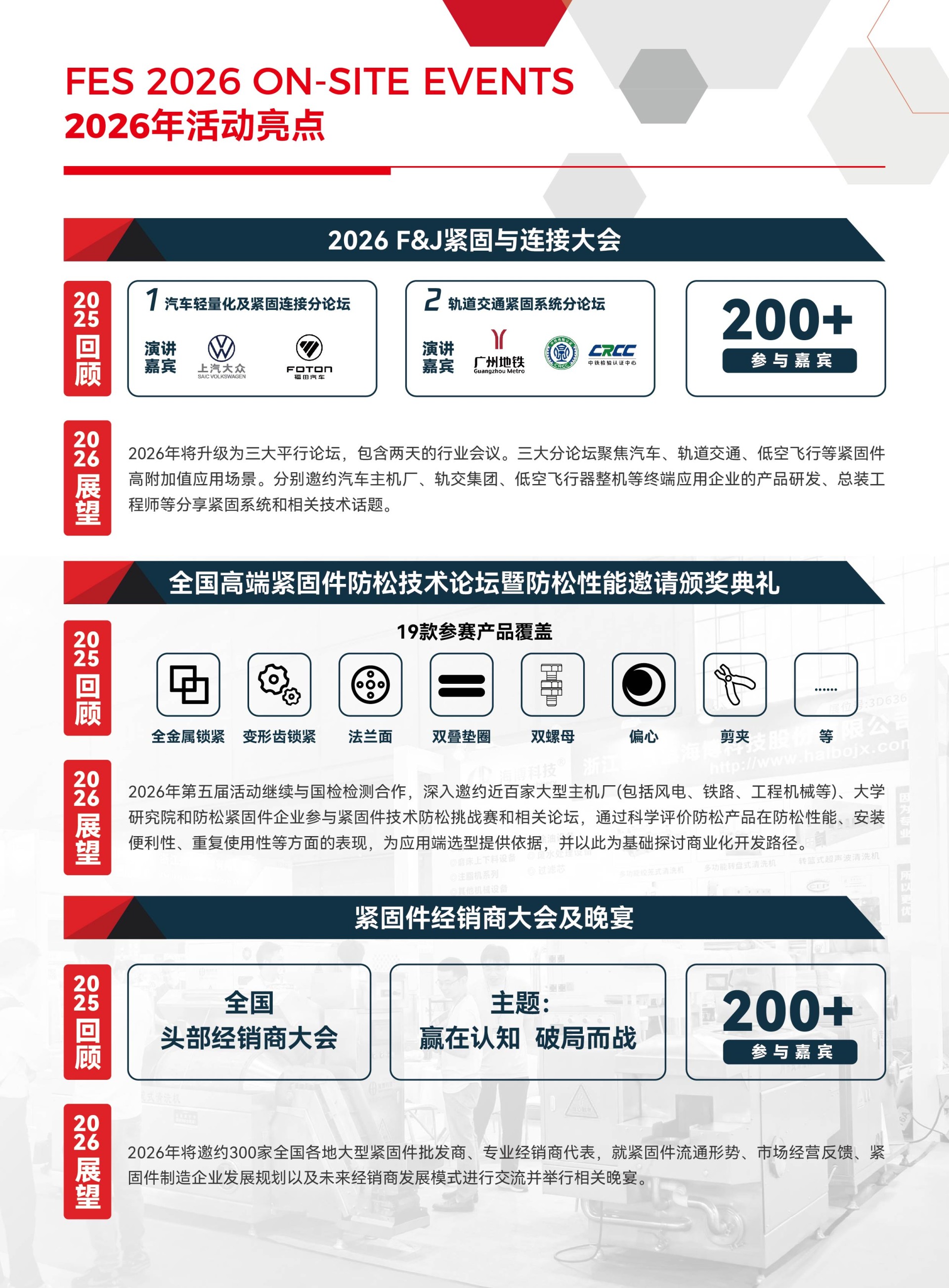 2025年第四届全国紧固件防松技术论坛邀约近百家大型终端用户 (包括汽车、风电、铁路、工程机械等)、大学研究院和防松紧固件企业参与。通过防松技术评审科学评价防松产品在防松性能、安装便利性、重复使用性等方面的表现,为应用端选型提供依据,并举办相关论坛此为基础探讨商业化开发路径。