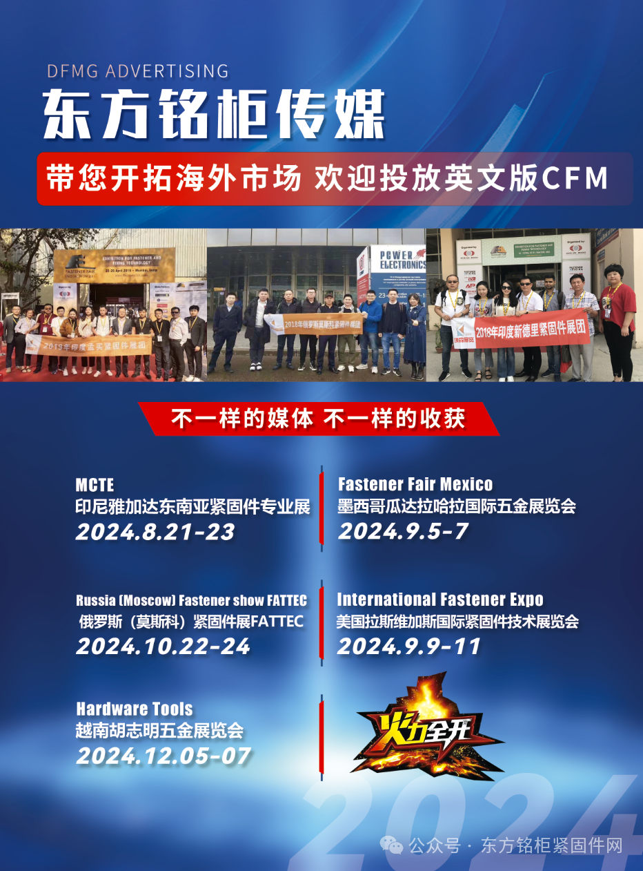 东方铭柜传媒2024年将继续前往国外,参加紧固件专业展览会,对于我们中国的紧固件企业,想要拓展国际市场,参加各类国外紧固件展会,是企业走向国际市场、承接海外订单的重要渠道。