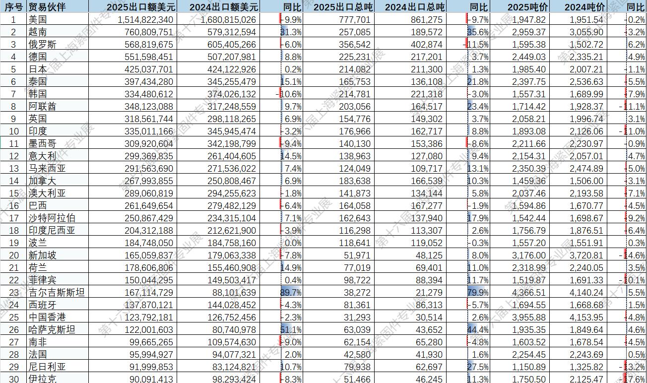 2025年紧固件出口目的地前30强合计出口额93.36亿美元,占总出口额78.3%,占比较2024年(79.6%)微降,市场分布正趋于分散,企业正在积极开拓新市场。